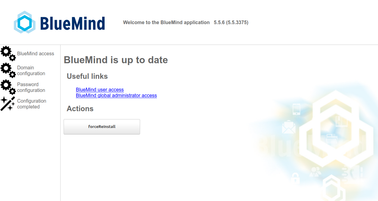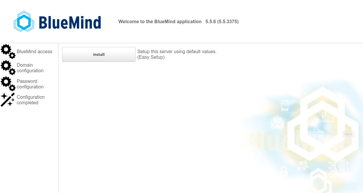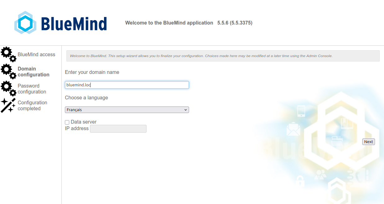 Once the Linux distribution has been Installing BlueMind, use your web browser to go to the BlueMind initial configuration page at the Url provided at the end of the installation: https://votre.serveur.mail/setup (be sure to enter https, not just http).