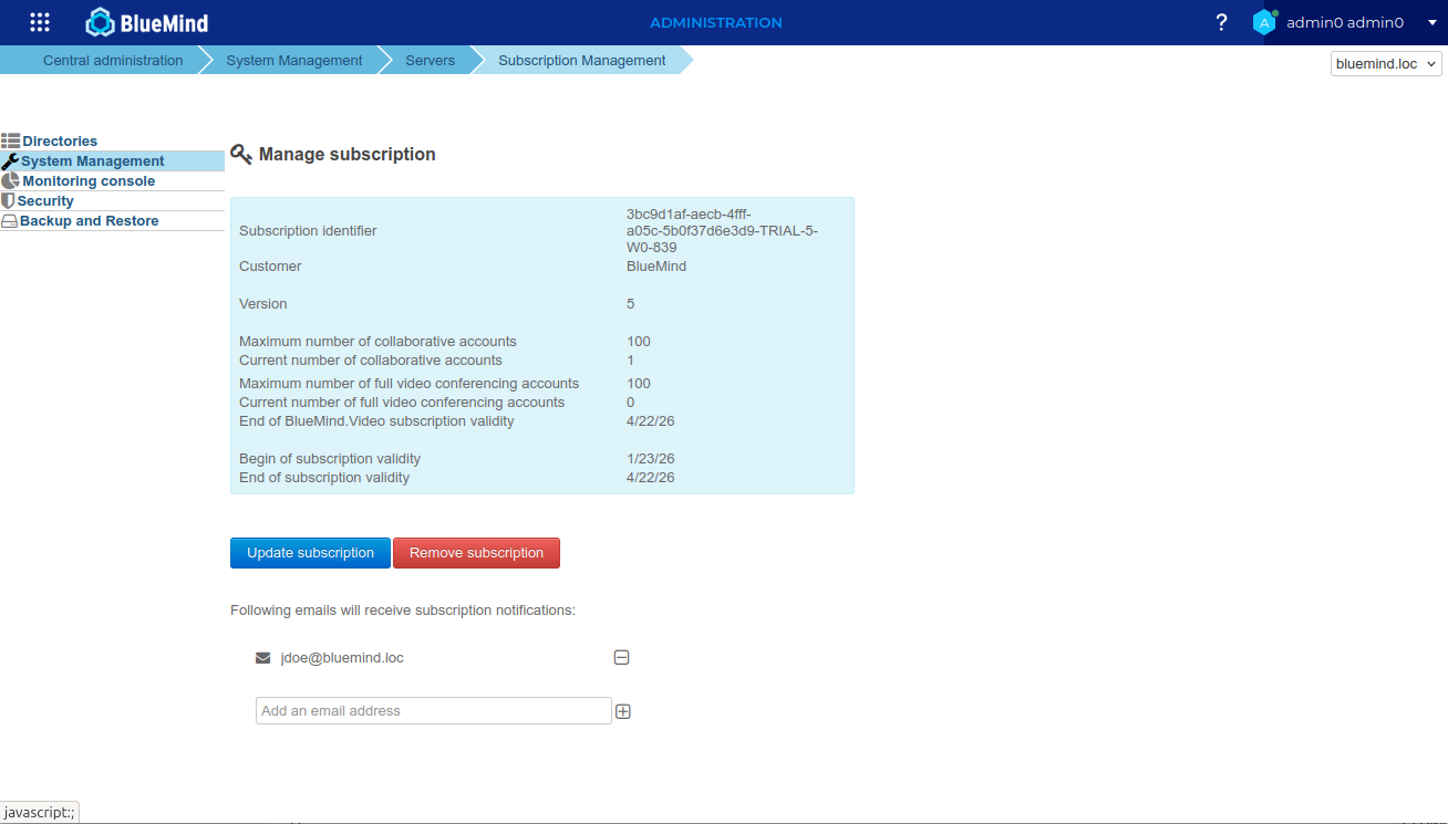This operation is to be performed on each BlueMind server by subscription (production, testing or evaluation).