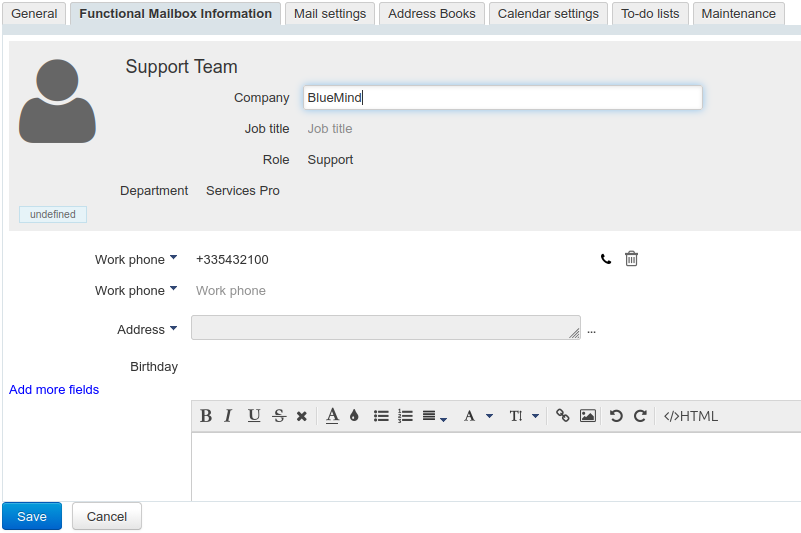 Here, the administrator can enter information such as telephone numbers and postal addresses, or assign a photo to be used throughout BlueMind (contact sheet, event invitation, etc.).