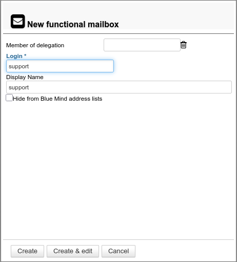 - Click on "Create" for a simple and direct creation or click on "Create & edit" to create the shared mailbox and access the configuration options.