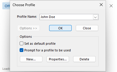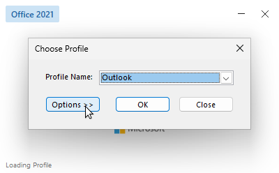 If the profile selection window is not available, see Microsoft's online help: Turn Outlook profile prompt on or off.