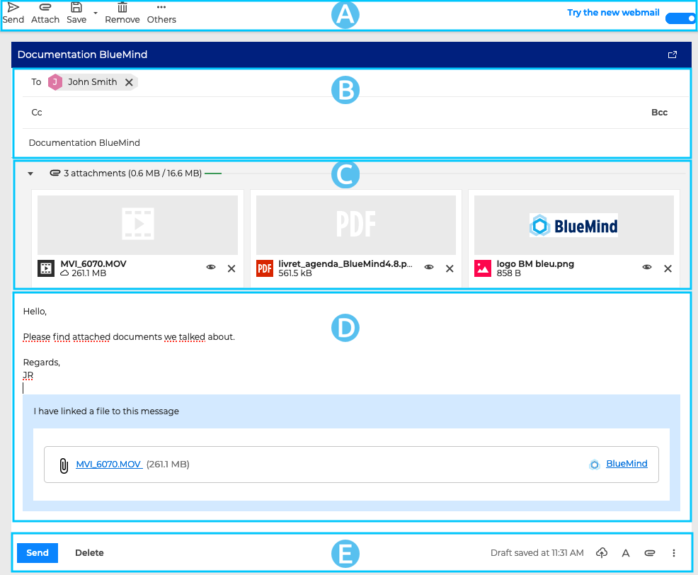 : in addition to showing when the message was last saved, this area also shows the main action buttons for a more intuitive and easier access: on the left, the send and delete buttons, on the right formatting, attachments, signature, template and display the "From" field buttons.