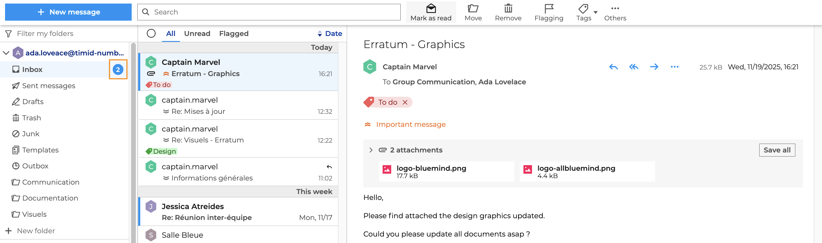 For further information, see Using the folder list and Using Shared Mailboxes.: the list of messages contained in the folder selected in column A. You can use the filters at the top of the list to select the types of messages you want to display. Details and possible actions appear when you hover over a message. The column width can be adjusted to accommodate message previews or to adapt to the type of screen used. For further information, see Managing the Message List.