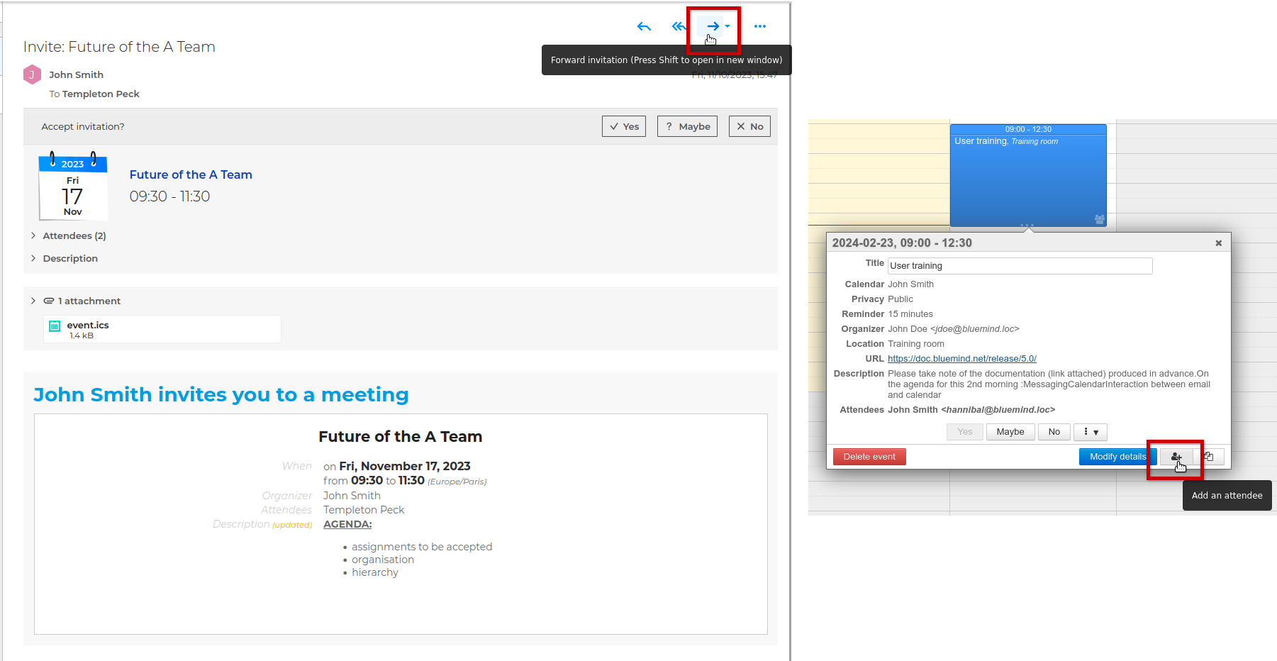 Invitation forward enables a participant to invite a third party to a meeting. They can do this from the invitation e-mail or from the calendar: