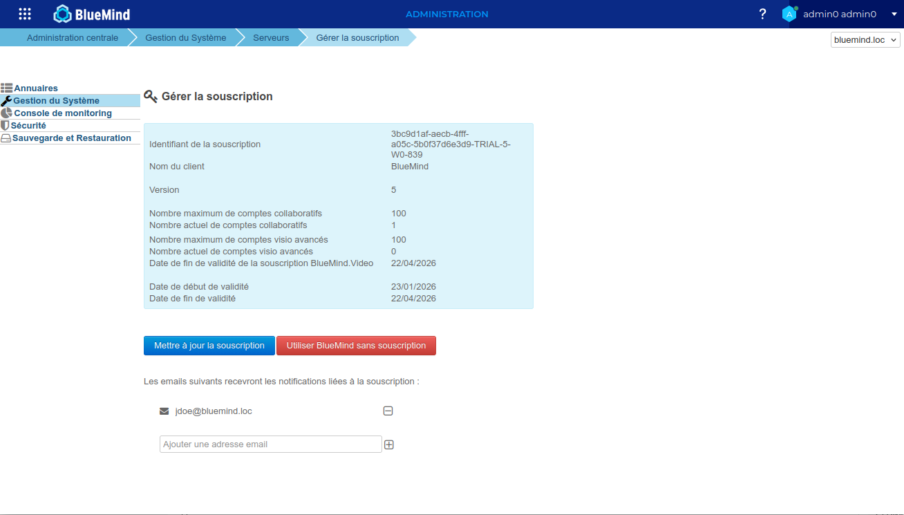 - Redémarrer BlueMind pour faire prendre en compte la nouvelle souscription