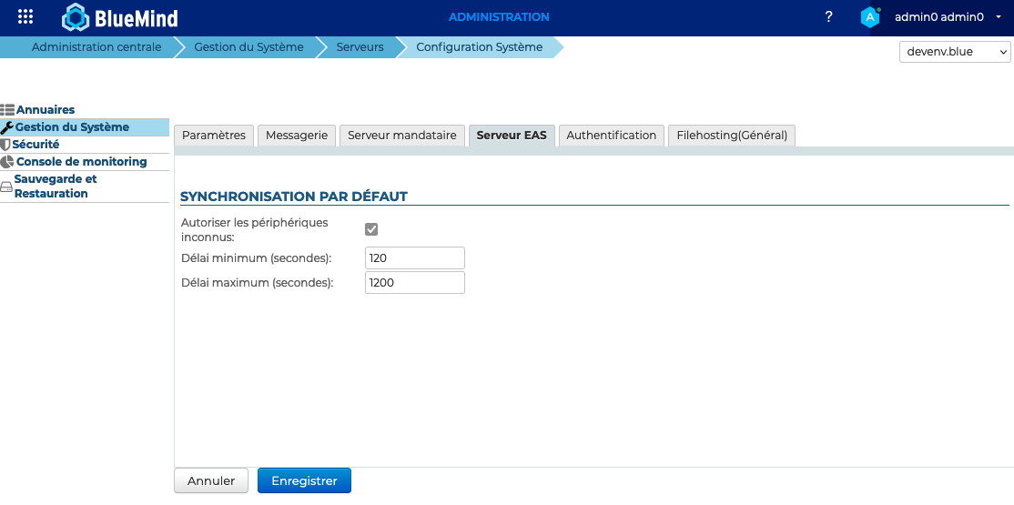 Certains appareils Android présentant des défauts de gestion du protocole EAS en version 16, BlueMind laisse la possibilité aux administrateurs de le désactiver ou l'activer. Lorsque le protocole EAS 16 est désactivé, les utilisateurs peuvent continuer à connecter leurs périphériques en EAS, c'est alors la version 14 qui est appliquée.