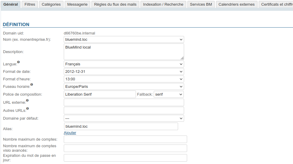 L'UID du domaine lui sert d'identifiant, il est unique dans BlueMind et n'est pas modifiable, en revanche peuvent être positionnés :