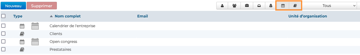 - Type d'entrées : Les 6 premiers boutons permettent d'afficher ou masquer un type d'entrées : utilisateurs, groupes, ressources, boites partagées, calendriers, carnets d'adresses.