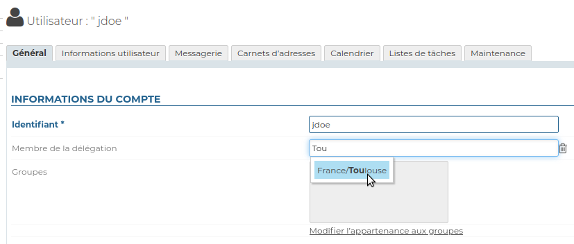 - dans l'onglet Général, renseigner le champ "Membre de la délégation" grâce à l'autocomplétion proposant les unités existantes :