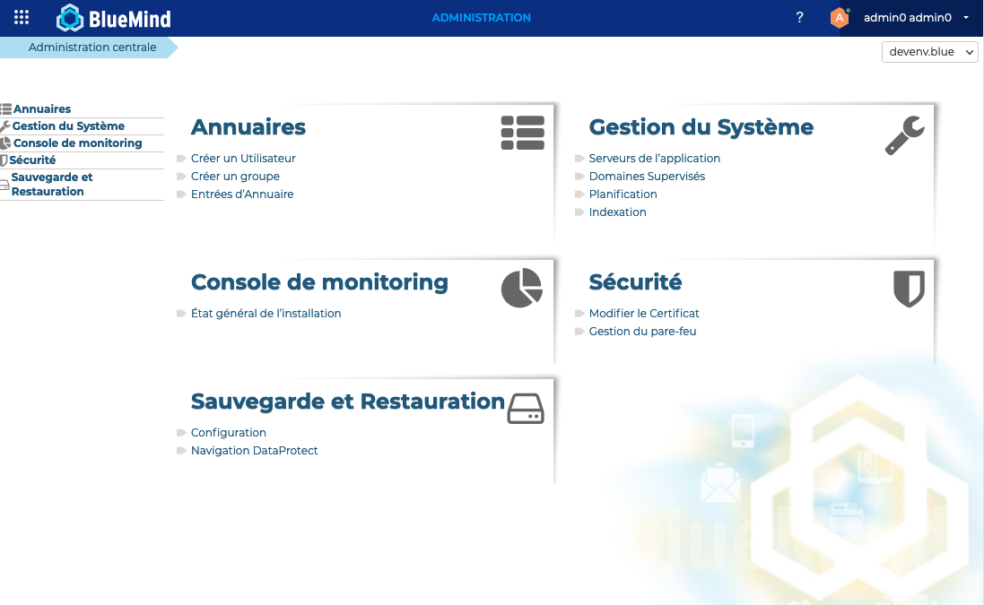 La console d'administration permet aux administrateurs d'accéder aux fonctions de la configuration du système et des serveurs, à la configuration des domaines, à la gestion des annuaires et entités, à la configuration des éléments de sécurité et de sauvegarde du serveur.