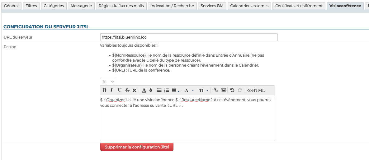Le patron peut contenir des variables, qui seront remplacées automatiquement dans le patron par le système :${NomRessource}: le nom de la ressource telle que définie dans l'annuaire (par défaut "Jitsi")${Organisateur}: le nom de la personne créant l'évènement dans le Calendrier${URL}: l'url d'accès à la conférence