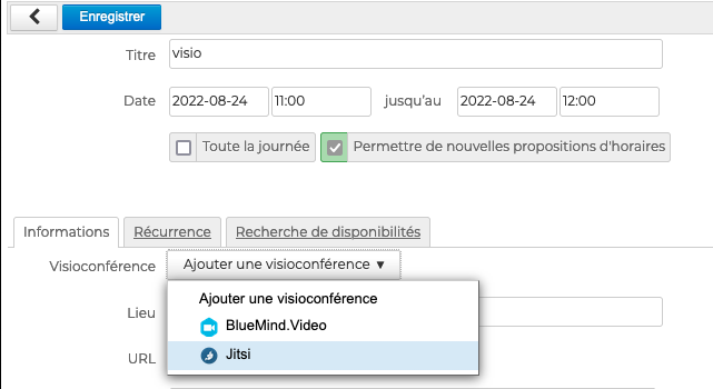 BlueMind peut être connecté à un serveur Jitsi afin de proposer aux utilisateurs de facilement créer des conférences et les relier à leurs réunions d'agenda.