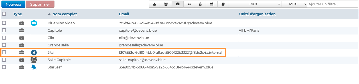 ⇒ une ressource nommée "Jitsi" est automatiquement créée et visible dans l'annuaire. C'est grâce à celle-ci que les utilisateurs vont pouvoir créer des visioconférences automatiquement. Pour en savoir plus, voir le paragraphe Droits d'accès (optionnel)