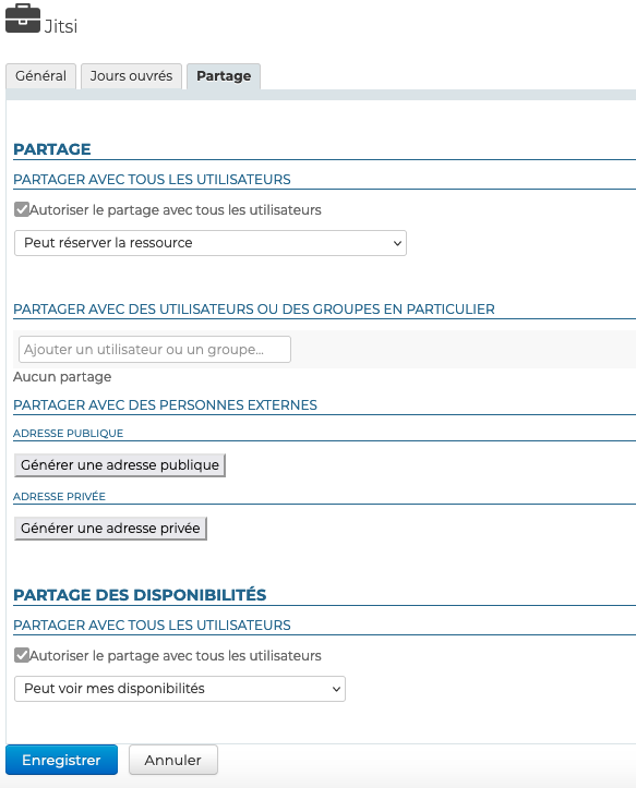 Cette ressource s'administre comme toute autre ressource, la gestion des partages ouvrant les droits à la réservation et, de fait, à la génération de liens de visioconférences. Ainsi, il faut donner un droit de réservation (droit de partage "peut réserver la ressource" ou supérieur) aux utilisateurs ou groupes souhaités pour que ceux-ci puissent créer des visioconférences pour leurs événements :