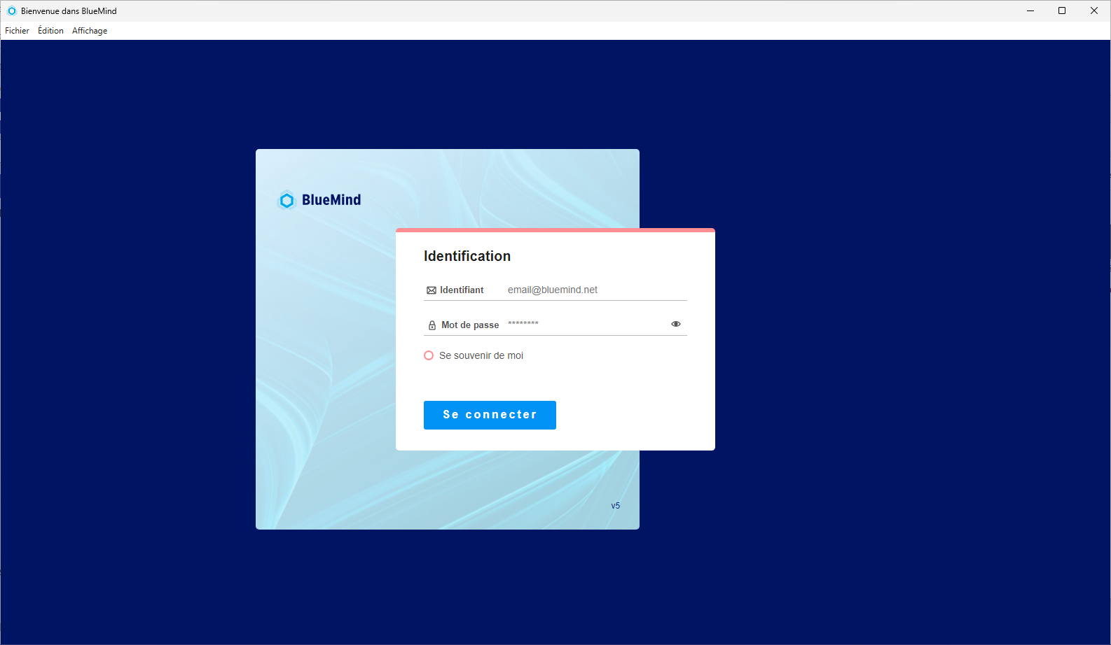 Une fois l'installation terminée, le logiciel s'ouvre et propose l'écran de connexion à BlueMind :