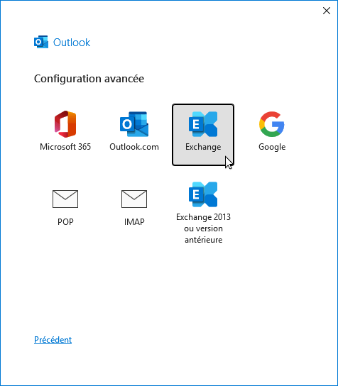 Outlook recherche les informations sur le serveur puis, si elles sont trouvées, demande le type de compte. Choisir le type "Exchange" :