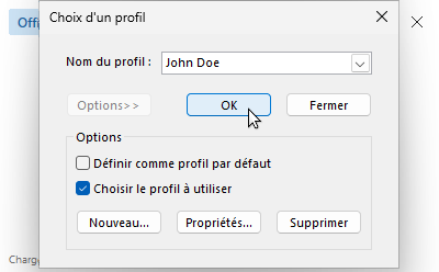 Créer un nouveau profil Outlook : le compte ne doit pas être ajouté dans un profil déjà existant, y compris le profil par défaut lors du lancement du logiciel.