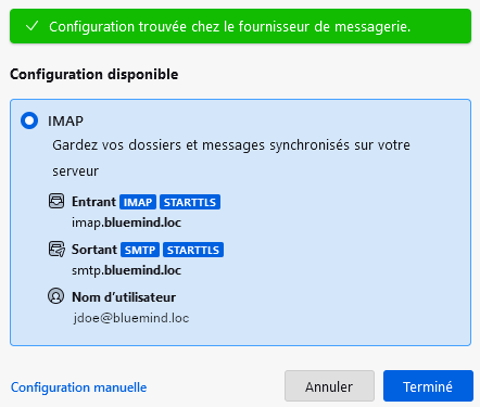 Thunderbird essaie de se connecter au serveur en utilisant ces informations puis affiche les informations trouvées et validées :
