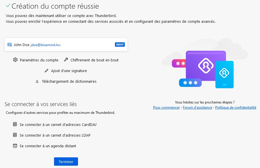 Thunderbird confirme la bonne création du compte et propose des options supplémentaires :