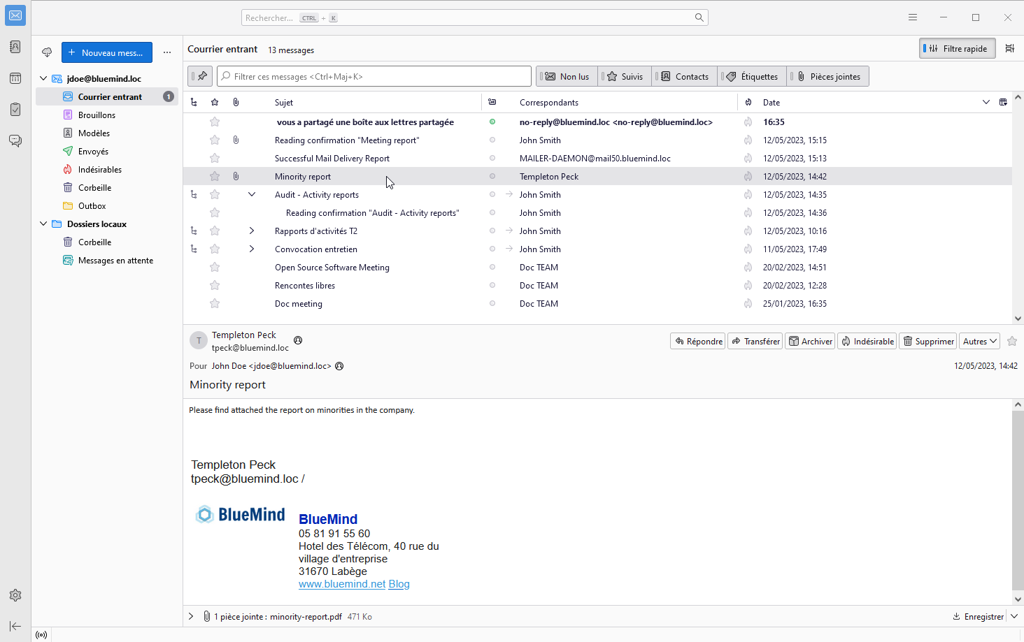 BlueMind apporte aux utilisateurs de Thunderbird la possibilité de gérer l'intégralité de leurs préférences BlueMind depuis leur logiciel, sans avoir à se rendre dans l'application web BlueMind.