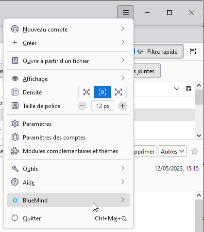 Un nouveau menu est aussi ajouté dans le menu "sandwich" de Thunderbird dans la barre de titre de la fenêtre, donnant accès aux différentes fonctions spécifiques à BlueMind (applications, préférences, synchronisation) :