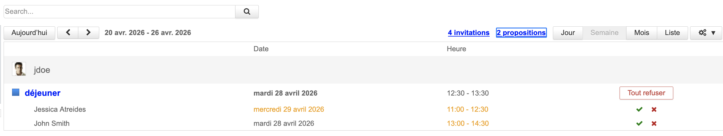 Lorsqu'un utilisateur propose un nouvel horaire, l'organisateur, ou son délégué, peut accepter ou refuser la proposition via :
