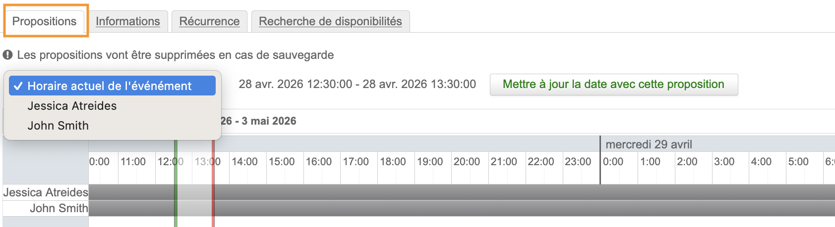 l'onglet "Propositions" qui s'affiche en modifiant les détails de l'évènement :