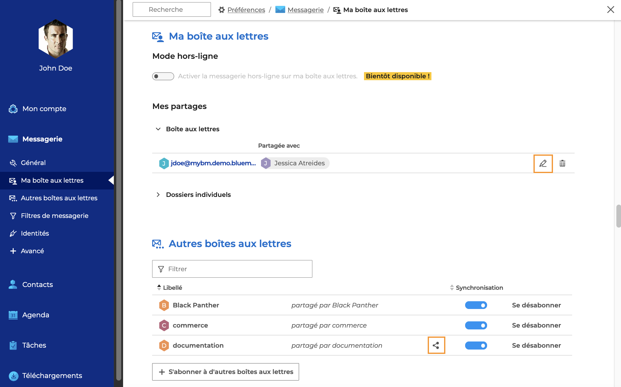 La gestion des partages de boîtes s'effectue dans les préférences du compte utilisateur.