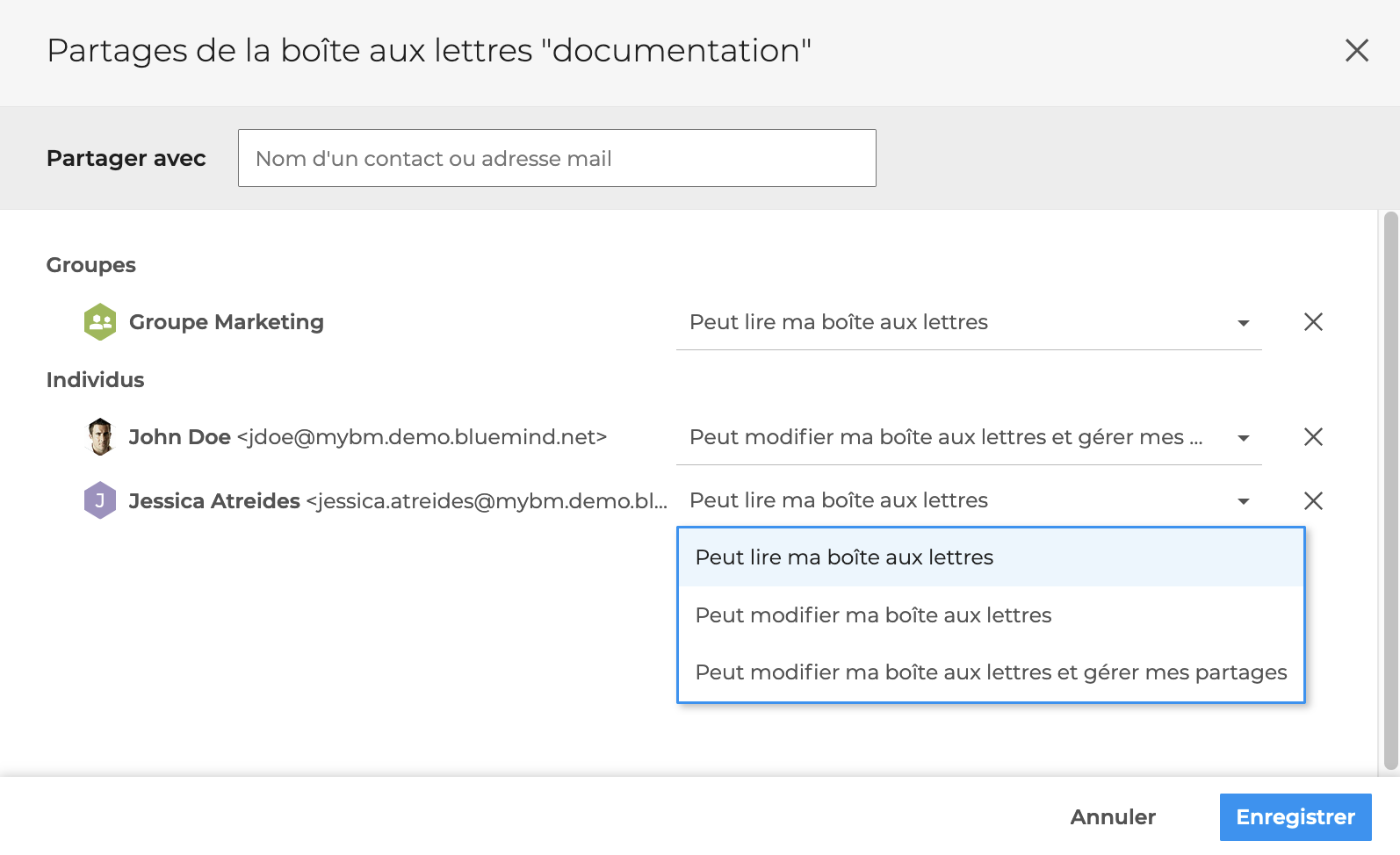 Les utilisateurs ont la possibilité de partager leur boîte aux lettres avec les membres de l'organisation pour qu'ils puissent voir les messages et dossiers, les modifier et même, en fonction du niveau de droits d'accès attribué, gérer les partages de la boîte aux lettres.