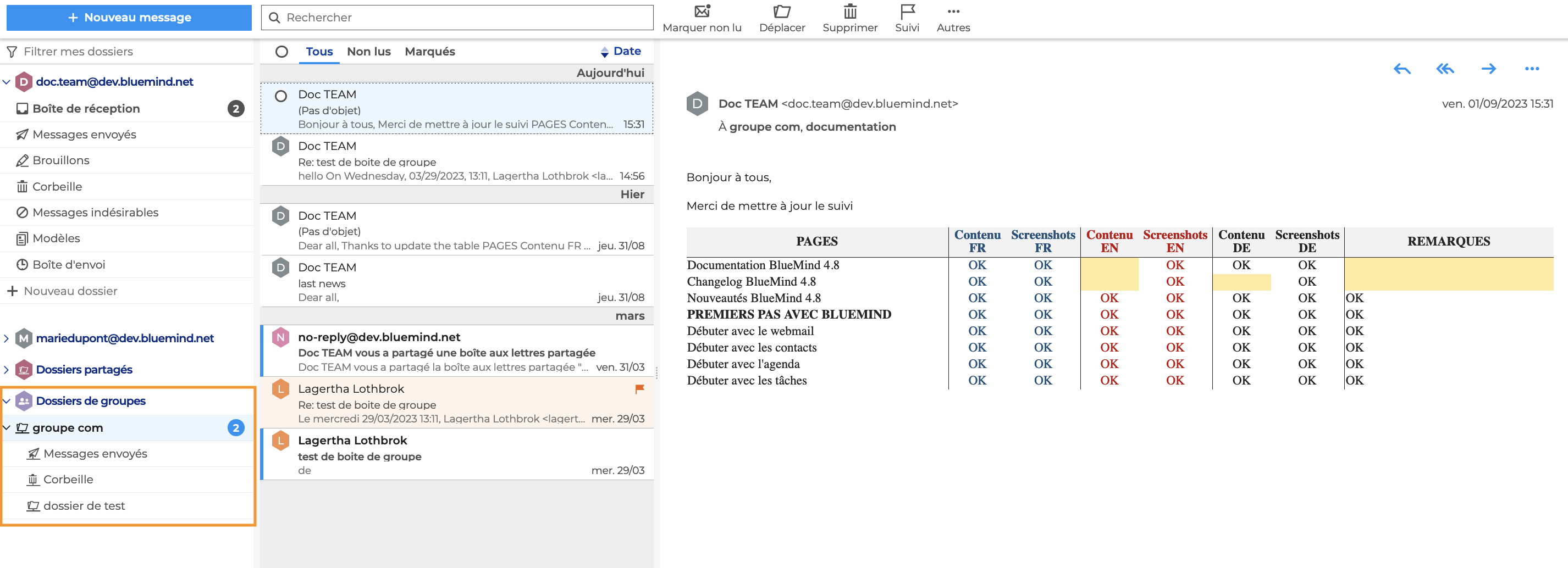 Les boîtes aux lettres partagées possèdent les mêmes dossiers par défaut qu'une boîte d'utilisateur : boîte de réception, messages envoyés, brouillons, etc. Elles possèdent aussi des carnets d'adresses, calendriers et listes de tâches qu'il est possible d'utiliser et synchroniser dans les applications BlueMind en ligne ainsi que dans les logiciels lourds.