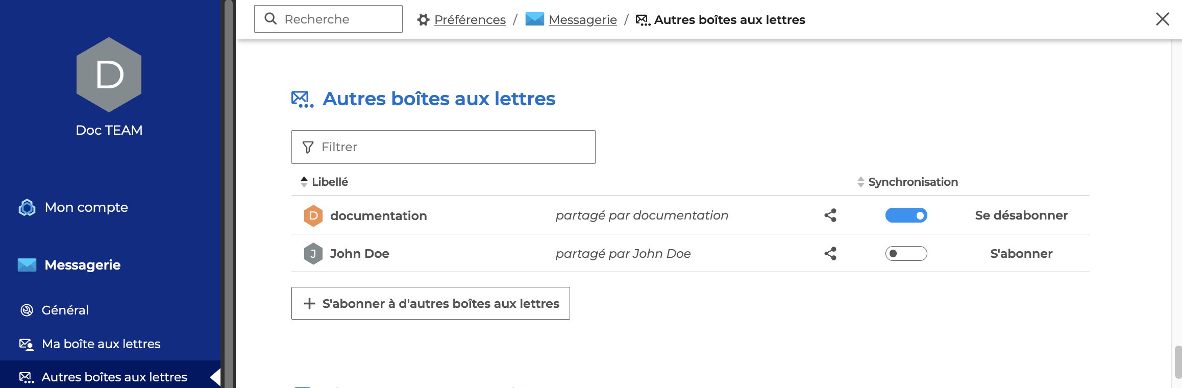 Une fois la notification reçue, pour voir la boîte aux lettres dans sa messagerie ou ses logiciels et appareils mobiles connectés, l'utilisateur doit activer l'abonnement dans ses paramètres de messagerie : Préférences > Messagerie > Autres boîtes aux lettres :