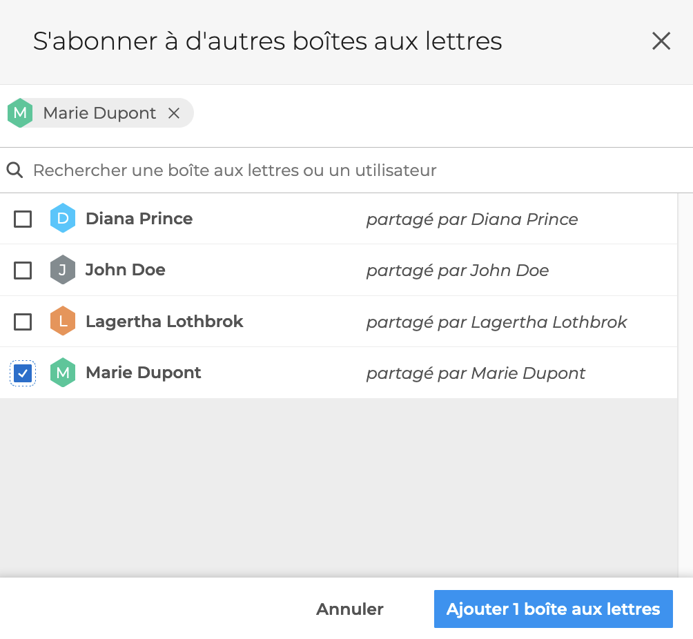 Une fenêtre pop-up propose alors toutes les boîtes sur lesquelles l'utilisateur a des droits, cocher la ou les boîtes aux lettres souhaitées puis cliquer sur Ajouter 1[2,3,...] boîte aux lettres :