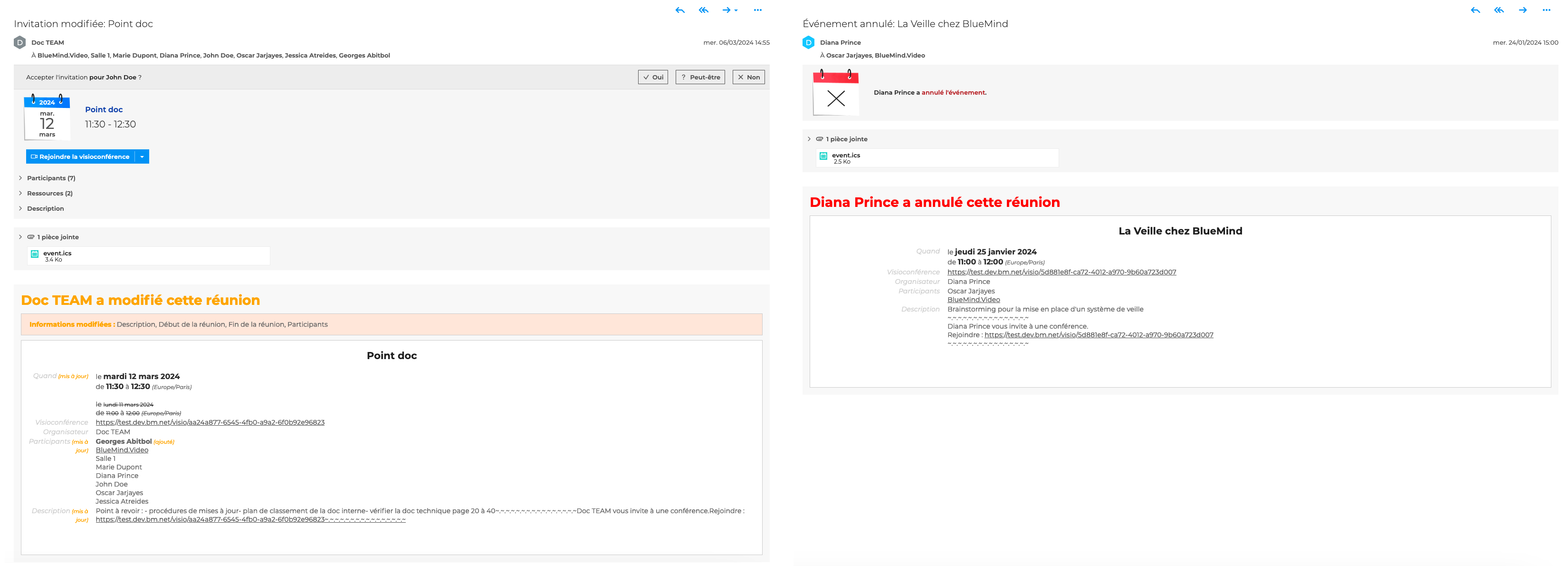 Lorsque l'organisateur supprime ou modifie une réunion, les invités reçoivent une nouvelle notification. L'objet de l'e-mail indique s'il s'agit d'une modification ou d'une annulation. Le détail des mises à jour est précisé dans la description.
