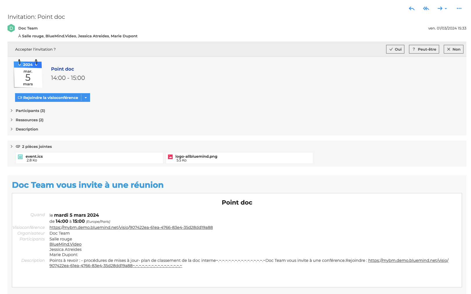 Lorsqu'une réunion est organisée depuis l'application Agenda, les invités reçoivent systématiquement une notification par e-mail leur permettant de consulter les détails de l'évènement, de répondre à l'invitation ou bien encore la transférer à un tiers.