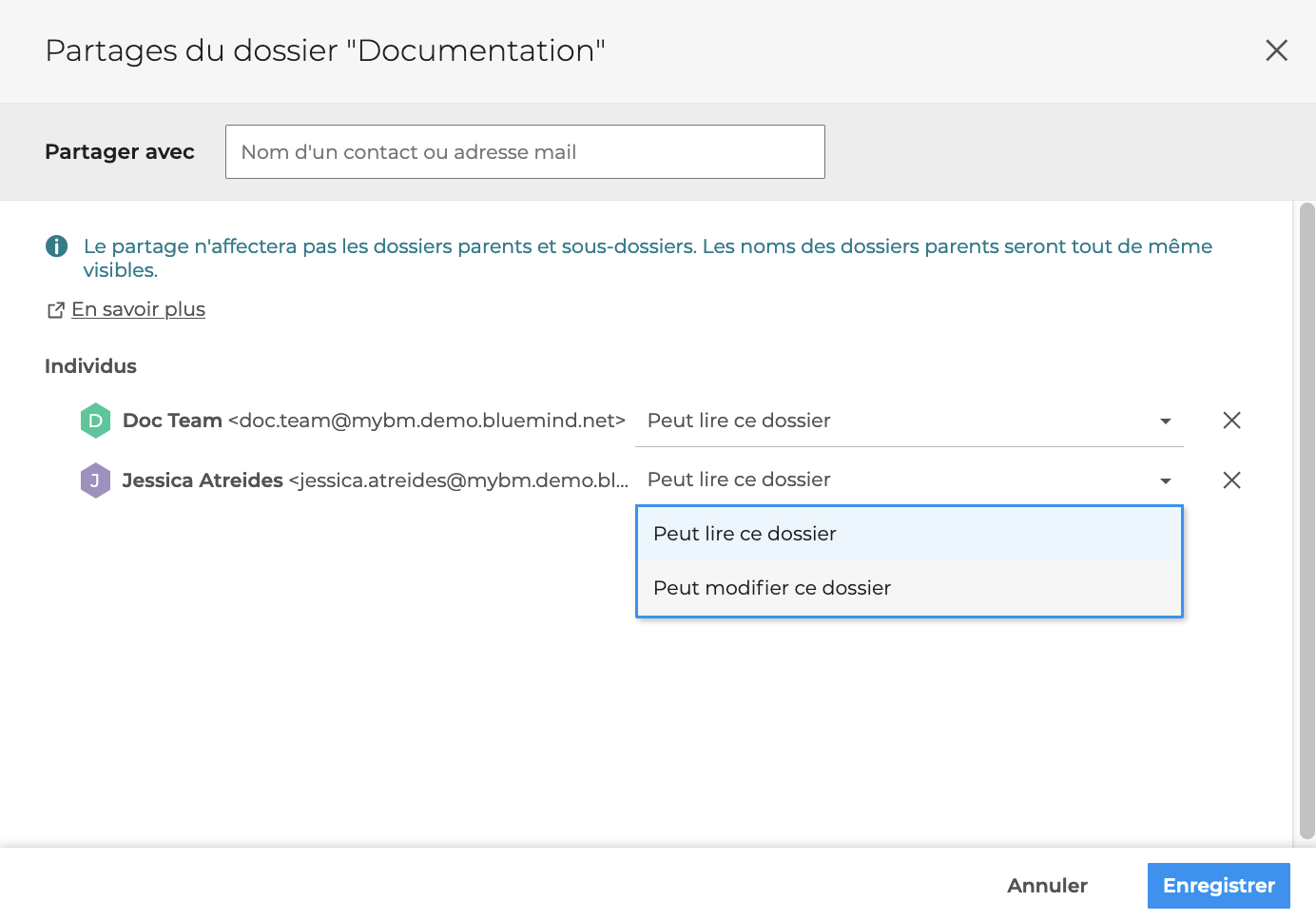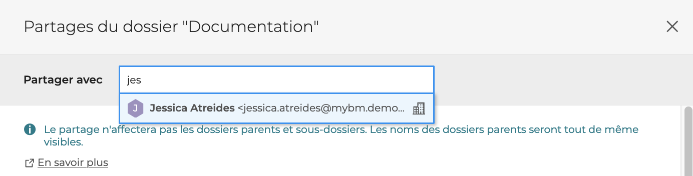 Un dossier peut être partagé avec autant d'utilisateurs internes que souhaité, y compris les boîtes partagées et les groupes avec une adresse de messagerie. À noter qu'il n'est pas possible de partager un dossier à un contact externe, même s'il fait partie de l'annuaire.