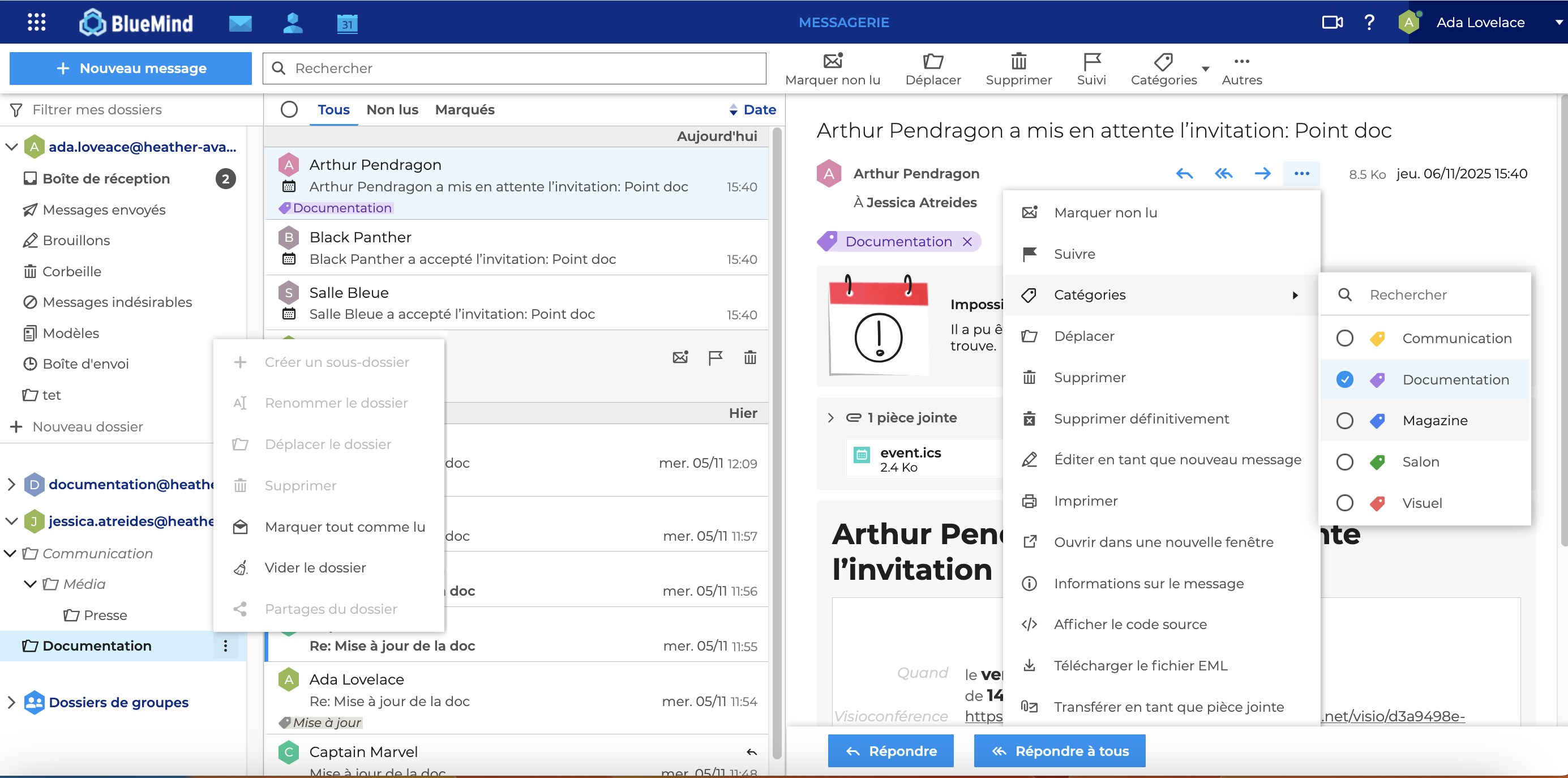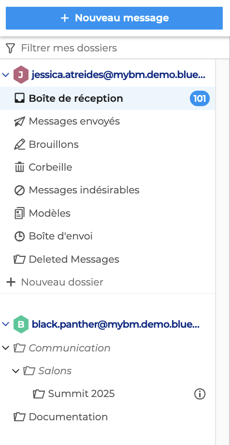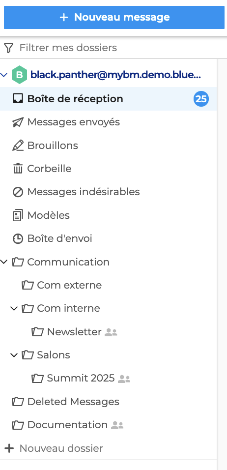 Une fois l'abonnement validé, le dossier partagé par l'utilisateur apparait dans la liste des dossiers, sous la boite aux lettres correspondante.