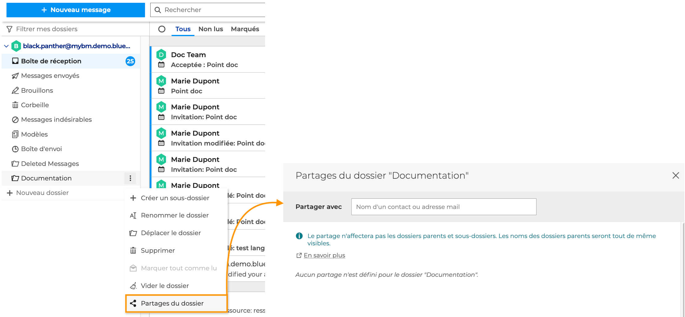 Le partage s'effectue dossier par dossier. Chaque sous-dossier est considéré comme un dossier à part entière et doit être partagé séparément. Le partage d'une arborescence n'est pas possible. Dans ce cas d'usage, l'utilisation d'une boîte aux lettres partagée est recommandée.