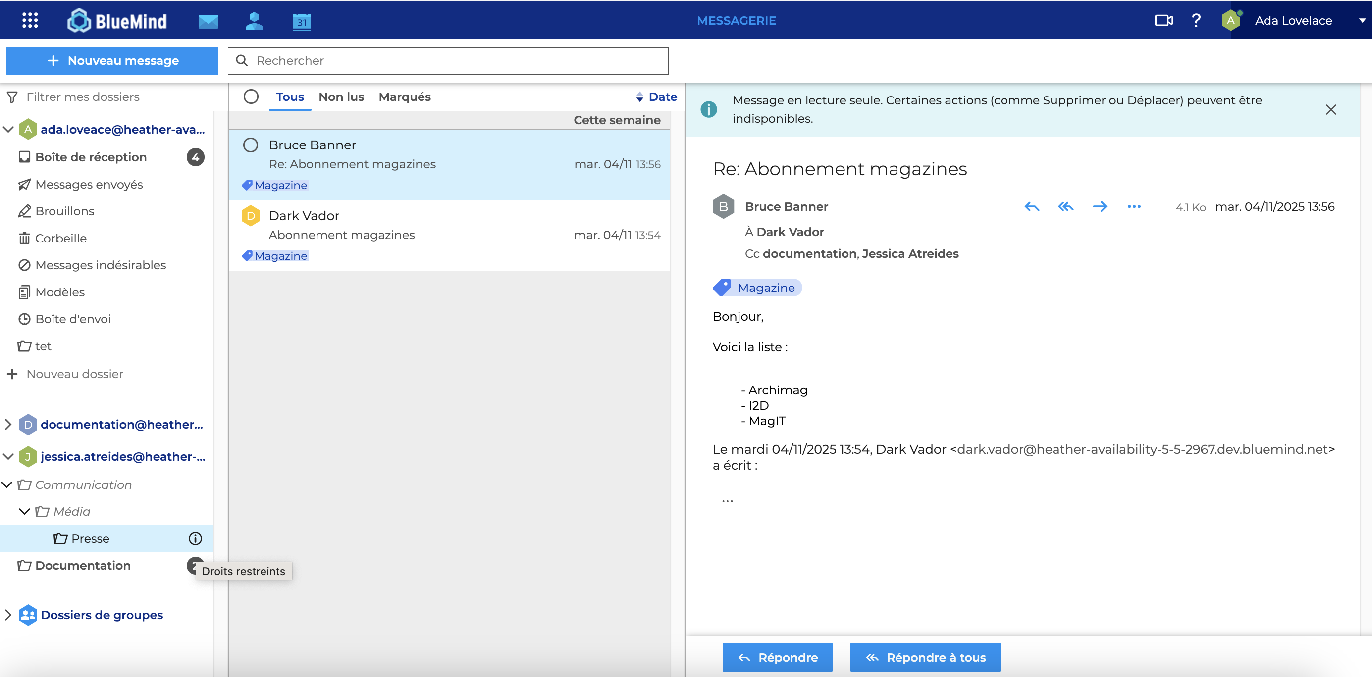 - Peut lire mon dossier permet à l'utilisateur de consulter le dossier et les messages qu'il contient en lecture seule. Un icône indique que le dossier est en lecture seule et un bandeau que les messages ne peuvent pas être modifiés. Il est cependant possible d'y répondre ou de les transférer.