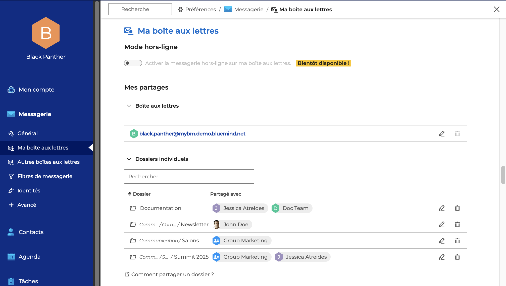 Il est également possible de gérer les partages depuis les paramètres du compte en allant sous Préférences > Messagerie > Ma boîte aux lettres > Mes partages > Dossiers individuels