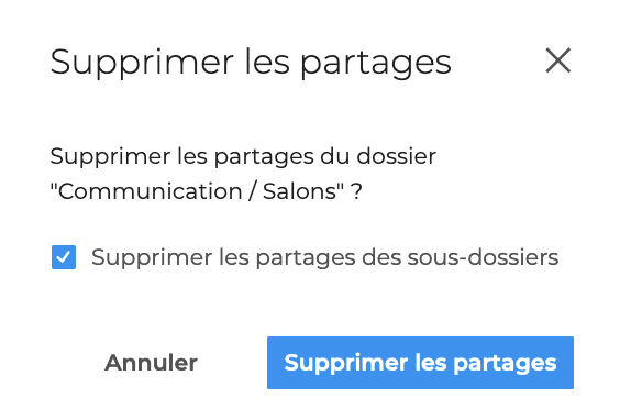 Cocher l'option "Supprimer les partages des sous-dossiers" pour supprimer les accès au dossier et l'ensemble de ses sous-dossiers en une seule opération