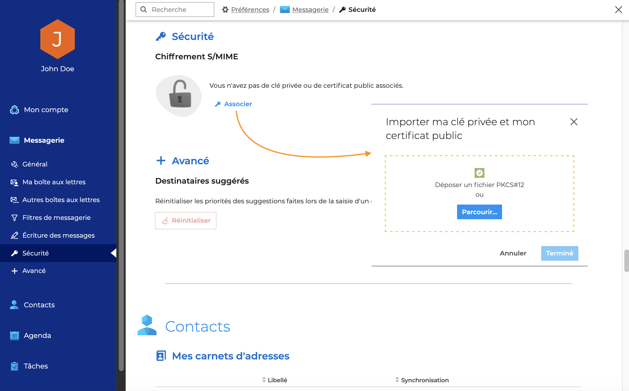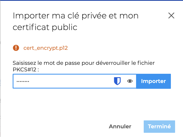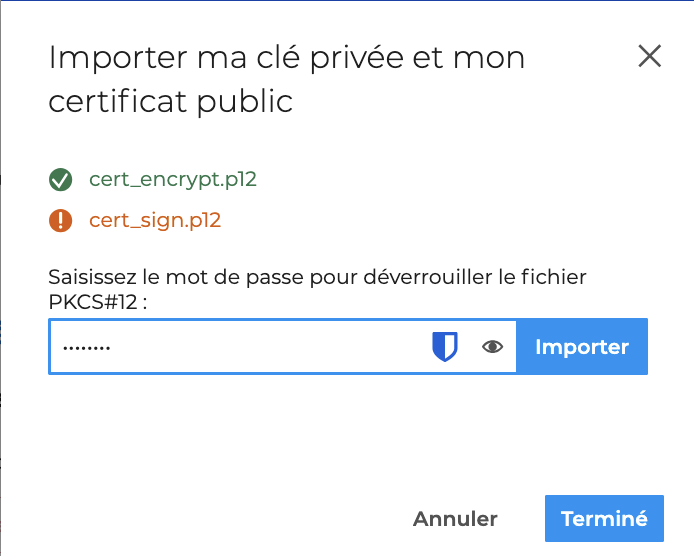 Afin de pouvoir chiffrer et signer les messages envoyés, il faut importer le(s) fichier(s) fourni(s) par l'administrateur contenant chacun une clé privée et un certificat public. Le nombre de fichiers à importer dépend des besoins et du type de certificats.