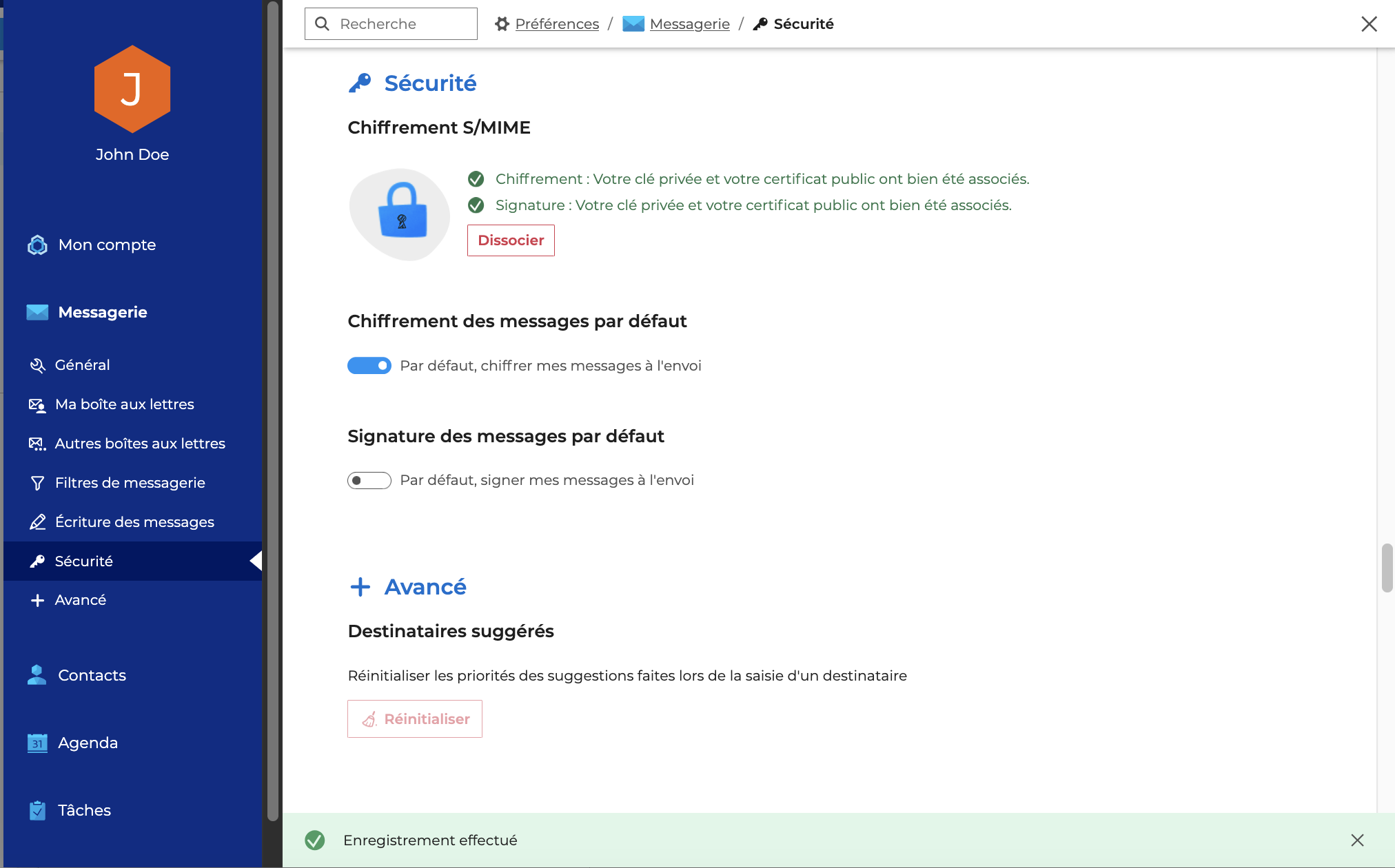 Le message "Votre clé privée et votre certificat public ont bien été associés" indique que le chiffrement et/ou la signature - en fonction du type de certificat importé - sont bien activés.