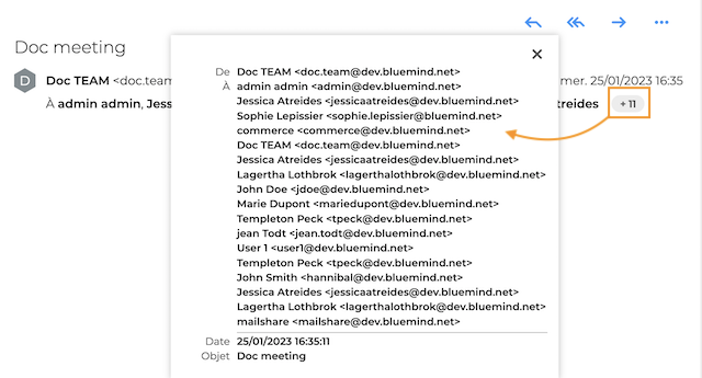 ℹ️ Lorsque le nombre de destinataires est important, seule la première ligne s'affiche et indique le nombre de destinataires supplémentaires. Cliquer sur les chiffres permet d'afficher une fiche récapitulative du message avec l'expéditeur, le sujet, la date et l'ensemble des destinataires.