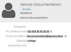 Il est également possible d'envoyer un message ou d'appeler un contact directement depuis sa fiche, d'indexer les contacts avec les catégories, de créer des listes de distribution, de partager les contacts entre groupes ou utilisateurs ainsi que d'accéder à un carnet d'adresses d'entreprise.