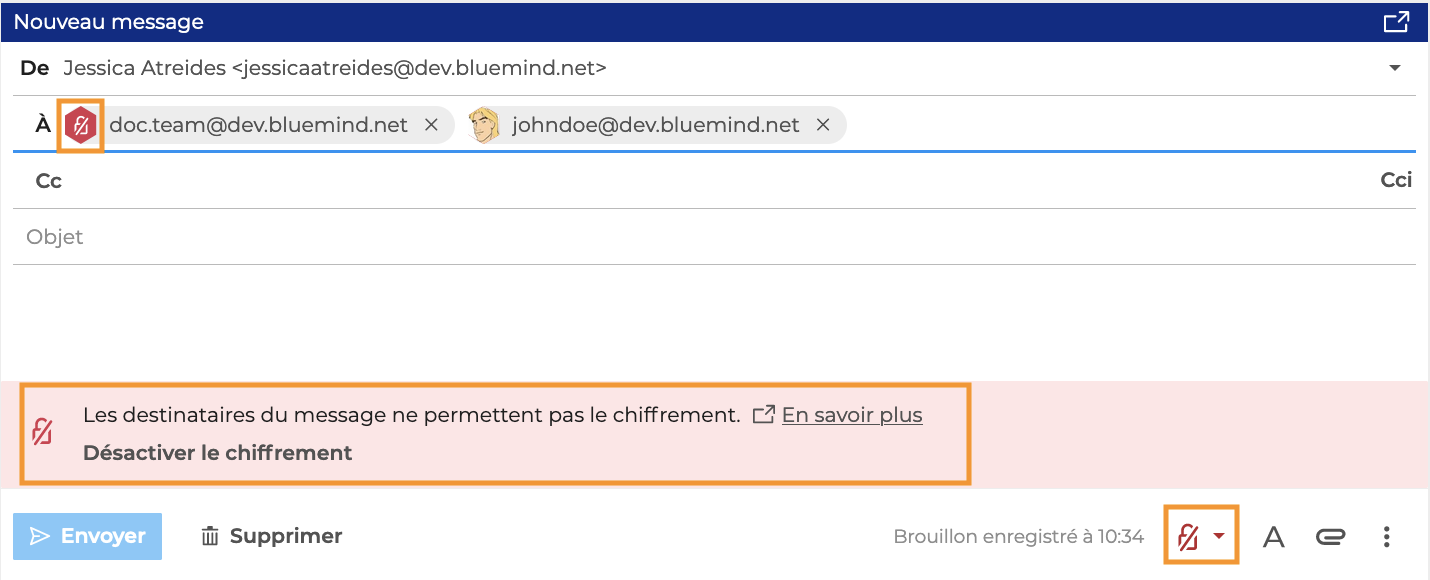 Si ce n'est pas le cas, un message d'erreur apparait lors de la rédaction du message, les options de sécurité s'affichent en rouge et un icône permet d'identifier le(s) destinataires(s) concernés :