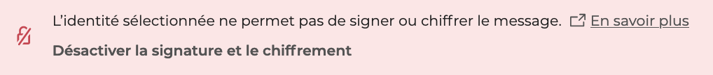Afin de pouvoir signer ou chiffrer un message c'est cette adresse mail qui soit utilisée dans le champ "De". Dans le cas contraire, ce message d'erreur apparait :