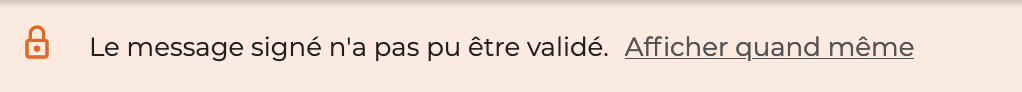 Le message peut tout de même être consulté en cliquant sur "Afficher quand même" mais avec prudence, l'intégrité du message n'a pas pu être vérifiée.