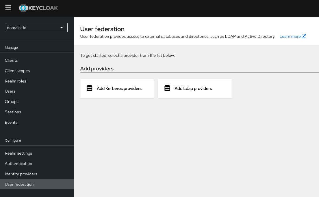 La partie "User Federation" permet de connecter et d'intégrer des sources externes de gestion d'utilisateurs, comme un serveur LDAP ou une base de données, avec Keycloak. Cela permet à Keycloak de fédérer des utilisateurs provenant de systèmes existants, sans avoir à les recréer dans Keycloak :