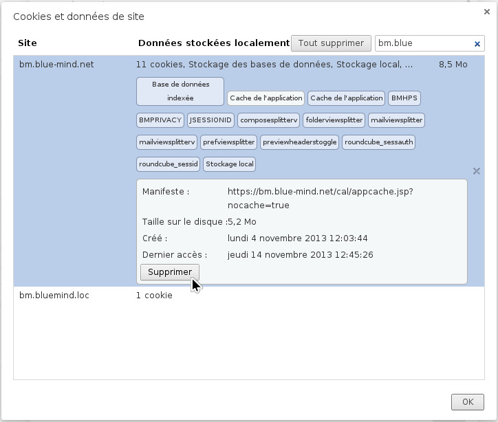Les applications clientes BlueMind telles que l'application de calendrier, de contact, sont enregistrées dans le cache du navigateur client pour permettre le lancement de l'application dans un mode offline.