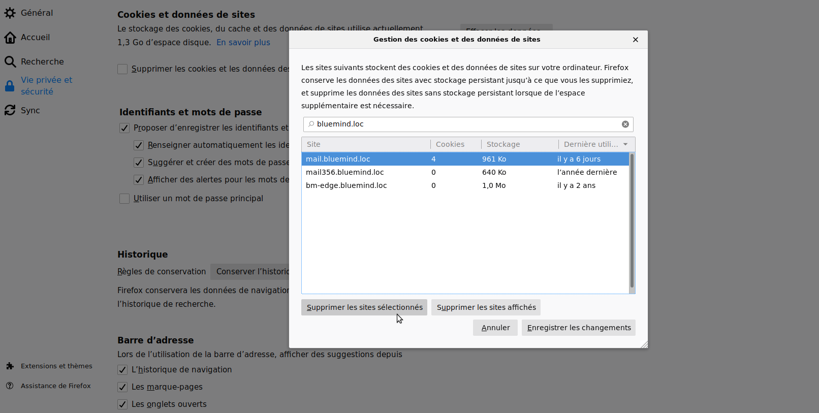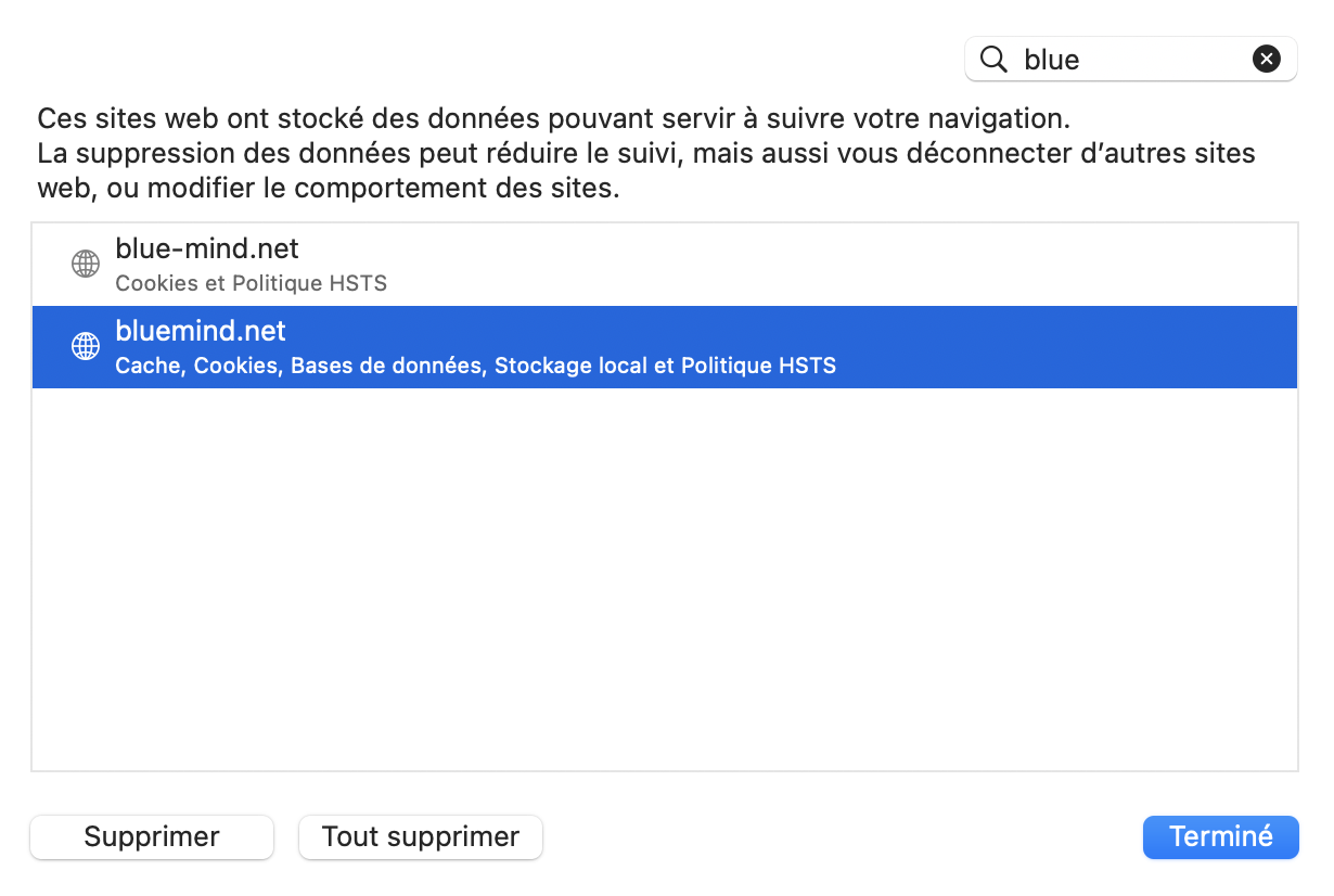 - Rechercher et sélectionner le site souhaité et cliquer sur le bouton "Supprimer les sites sélectionnés" :